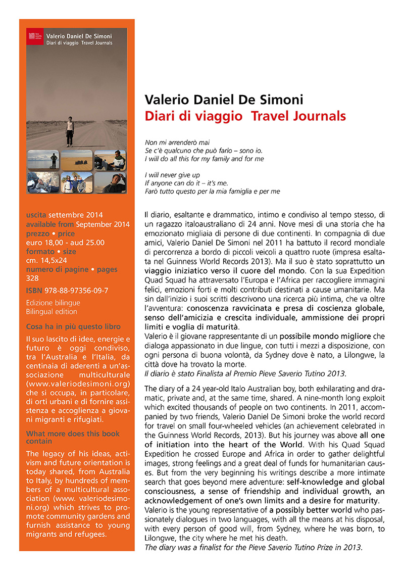 On the 17th of September, the VDSA held a press conference at the Auditorium in Rome presenting “Diari di Viaggio – Travel Journals”, the second volume of Valerio’s diaries to be released. A variety of speakers, including literary critic Filippo La Porta, writer and actor Guiseppe Cederna, socio-political and cultural theorist Franco Berrardi Bifo, youth music and culture expert Gino Castaldo, the publisher, Luca Sossella and representatives from Oxfam and Greenpeace Italia explored various elements of the book. The event was hosted by Rai Tre radio presenter Guido Barbieri.